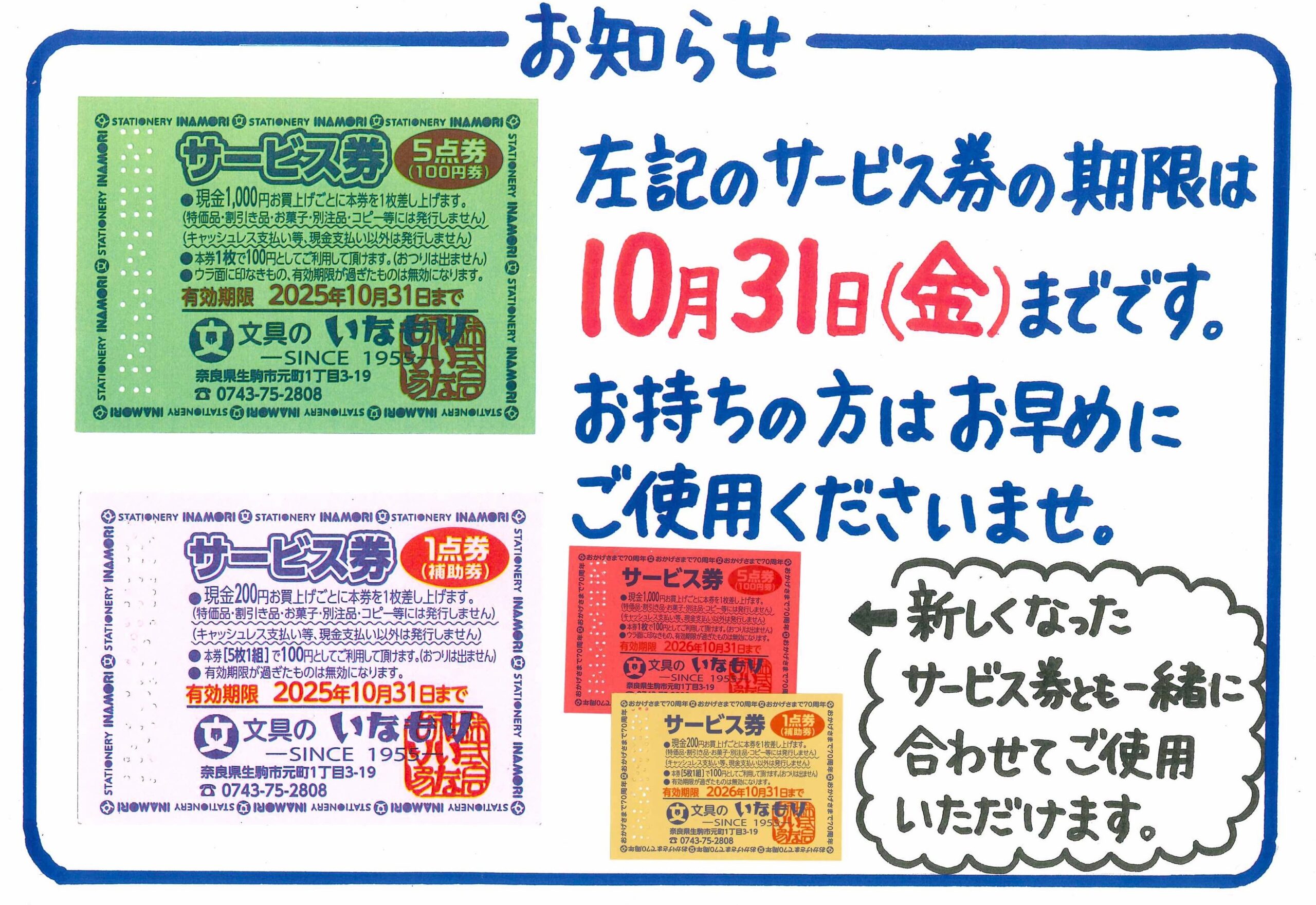 緑色とピンク色のサービス券(いなもり券)の有効期限が10月31日(金)までとなっております。